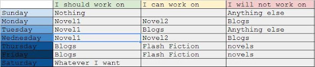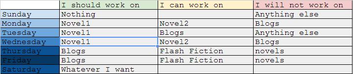 I didn’t think of this on my own. Like everyone in my generation and younger, I had the spark of a thought, did a Something search, and let the internet fill in the blanks. It’s with that in mind that I am attempting to create a reasonable schedule for my writing time by day. Is that too controlling or is it a nice try at focusing the laser beam? I’m not sure yet. It looks something like this…