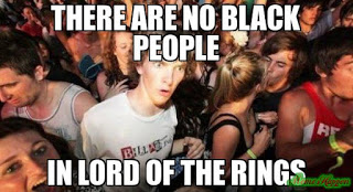 Additionally it belies some of the “magic” of the books. I’ve written some on how Pat Rothfuss called it “scary” that nobody really realizes that there are no female characters in The Hobbit. I call it a good story. Surely some female readers noticed it and maybe it affected their reception of the book, however few people notice it because it’s not a book about gender. It’s a fantastical adventure. Perhaps some of the same can be said about Rings: you may not notice all the white people or, if you do, you don’t care because you’re swept up in the tale.