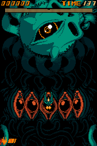 One clue to tip me off was the fact that setup was a breeze. It recognized my arcade stick immediately without any calibration, altering the tooltips accordingly. The differing game modes, affectionately titled \”White Vanilla\” instead of \”easy,\” for example, are all exceptionally rearranged to ease the player in and teach the different mechanics and patterns. I would call their (it\’s two dudes) design approach almost avant garde, as we zap from one area to another with little flow or transition. One minute were in terrestrial air space, the next we\’re racing across a bone canyon to face a giant skull.