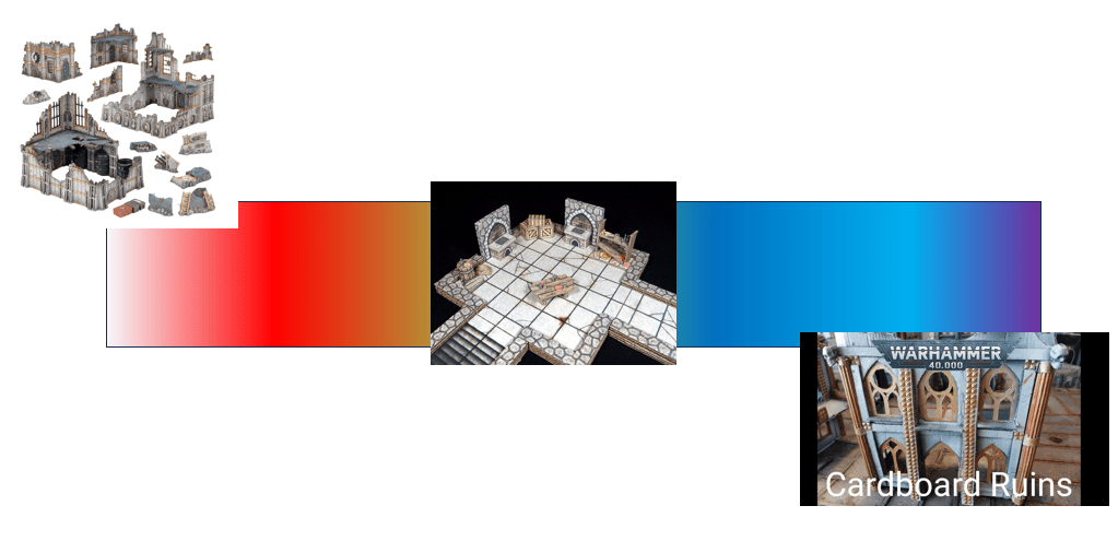 Sculpted plastic terrain always looks fantastic (especially Warhammer terrain) but it’s expensive as hell and a lot of work to paint. Paper terrain is cheap and easy to make, but does not lend itself well to the immersive quality of miniature gaming I crave. So let’s do a cost-benefit analysis and see what kinds of compromises I need to make with myself in order to stop hyper-focusing on miniature ruins.